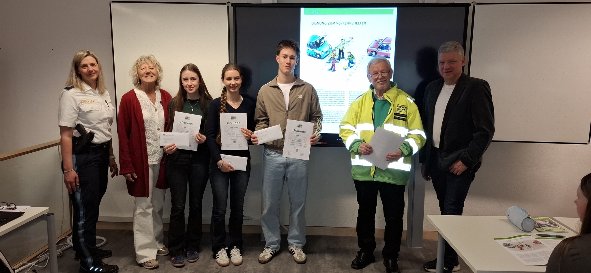 Unmittelbar nach der Ehrung war der Schulvormittag am JGG für die Schüler-lotsen in der Hand der Verkehrserzieherin Raffaela Scheuplein von der Polizei-station Waldkirchen, es stand die Ausbildung von 50 neuen Schülerlotsen auf dem Stundenplan, am Mittwoch davor waren bereits in Freyung neue Lotsen ausgebildet worden.