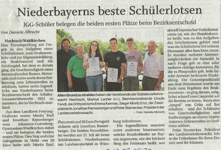 von Schülerlotsen kein schwerer Verkehrsunfall mehr mit Verletzten oder gar getöteten Schülern passiert. Wir unterstützen die Schulen mit Belohnungen der Lotsen wie Ausflügen oder Einladung zum Pizza- oder Eisessen und führen jedes Jahr bayernweit einen Wettbewerb durch, bei dem sich die Lotsen zunächst im Landkreis messen, danach die Kreisbesten im Bezirksentscheid Niederbayern antreten und hier wiederum die Sieger dann im Landesentscheid den besten Schülerlotsen Bayerns ermitteln.